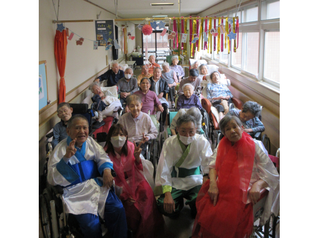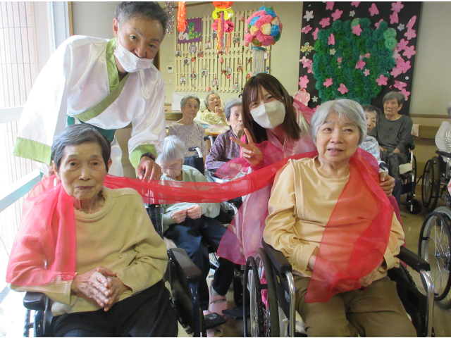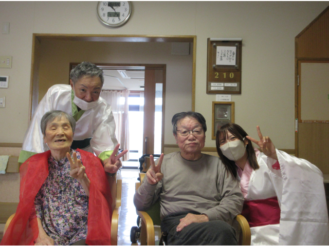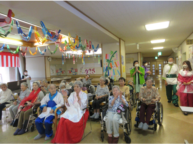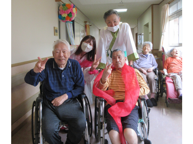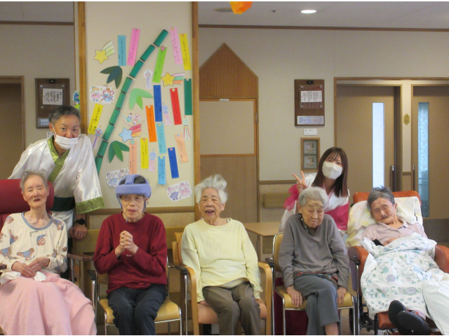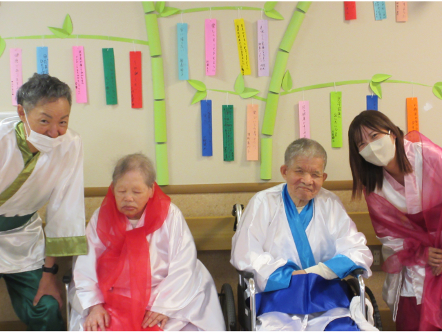 7月2日、小牧苑では七夕会🎋を行いました☆彡 午前の部では、各フロアに織姫と彦星が七夕の音楽にのって登場!一緒に撮影会を行いました📷✨ 皆さん羽衣を身にまとってニコニコです(*^-^*)