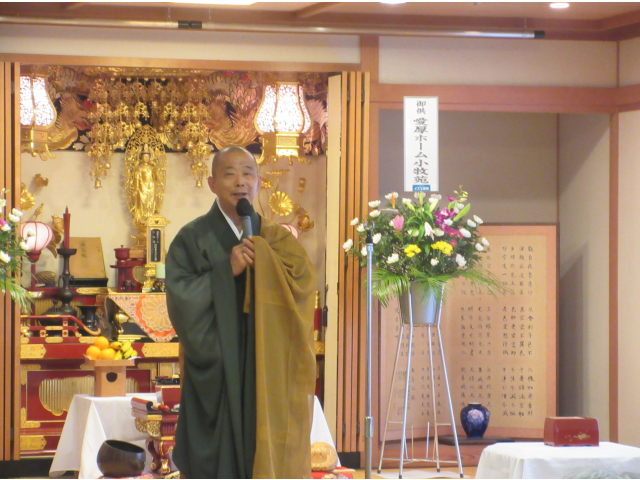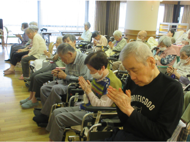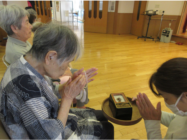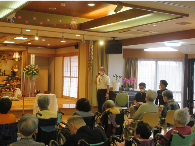 9月5日、小牧苑では秋の彼岸法要を行いました。 龍洞院のご住職にお経を唱えていただき、利用者の方々と職員で故人のご冥福をお祈りしました。 最後には、ご住職からのありがたい話を、皆さん真剣に聞き入っていました。