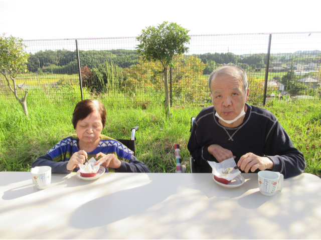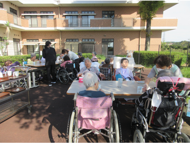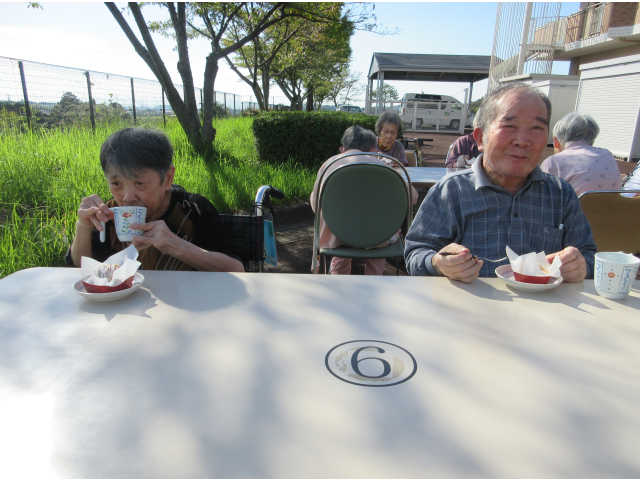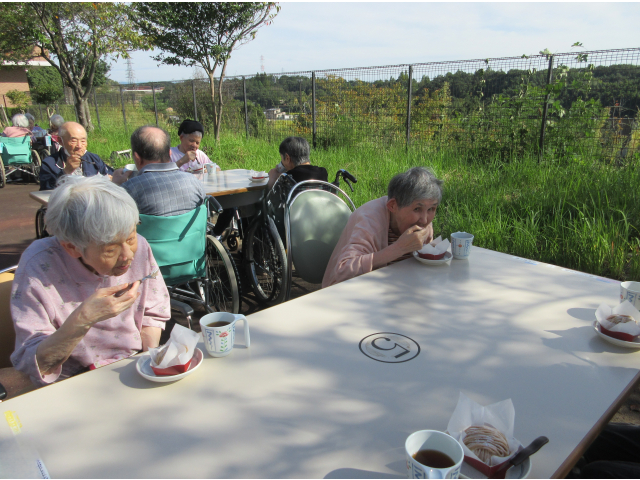 10月8日、1丁目のみなさんとともに、あおぞら喫茶を行いました😊🌳暑いくらいの天気となり、木陰を利用して楽しむことにしましたケーキはいつもより大きくちょっと豪華なモンブラン、飲み物はコーヒーと紅茶を用意しました☕皆さん大きなケーキに舌鼓しながら思わず笑みがこぼれ、会話も弾みますゆったりとした時間を過ごすことができて良かったですね(*^-^*)