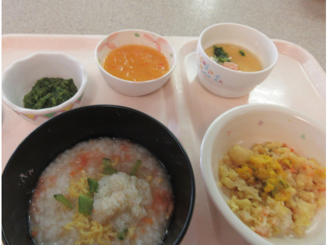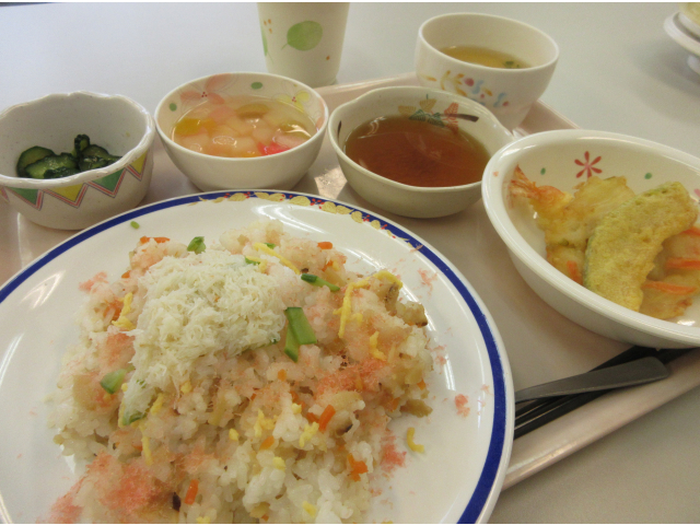 昼食では、ズワイガニを使った蟹ちらし寿司、エビと野菜の天ぷら盛り合わせ、茶碗蒸しの銀あんかけ、胡瓜の生姜醤油和え、デザートでした(*'▽') いつもより豪華なお食事に、普段あまり食が進まない方もペロリと召し上がっていました♪ おやつではパフェを用意してますが食べれるかな?