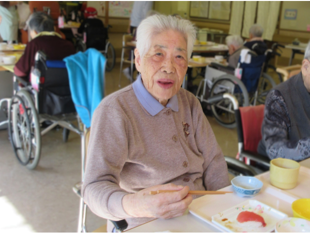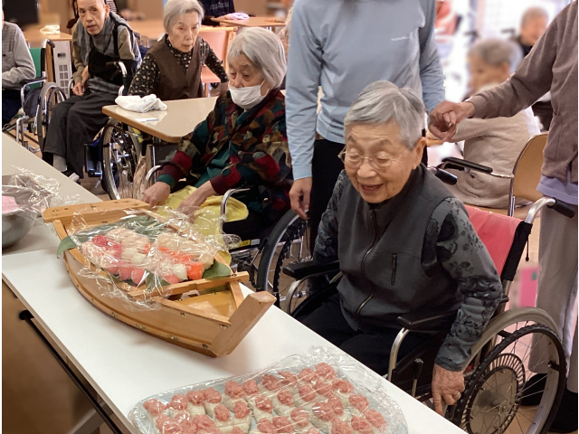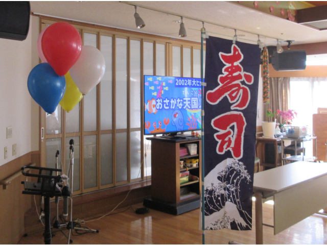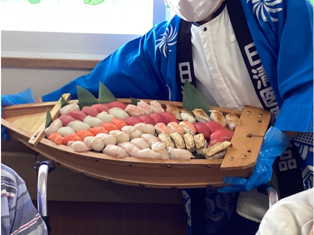 寿司祭りでは寿司職人さんをお呼びし、利用者のみなさんの前で寿司を握っていただきました。職人さんのパフォーマンスに、みなさんの歓声が響きました😊