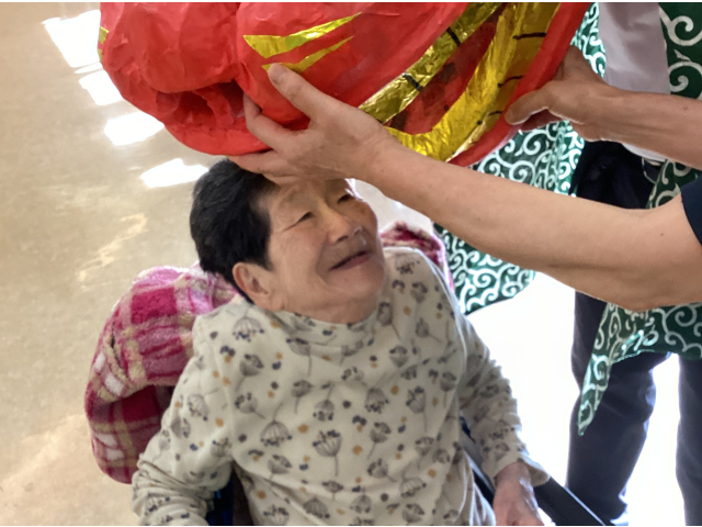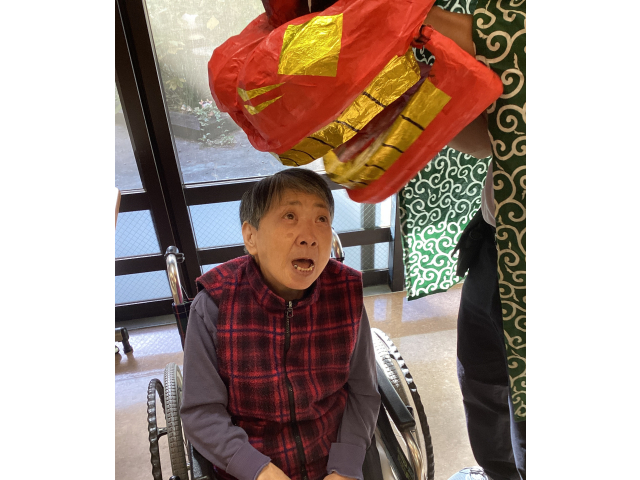 目の前に現れた大きな獅子舞に、みなさんびっくり仰天!