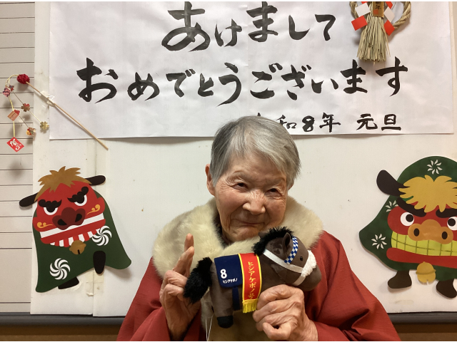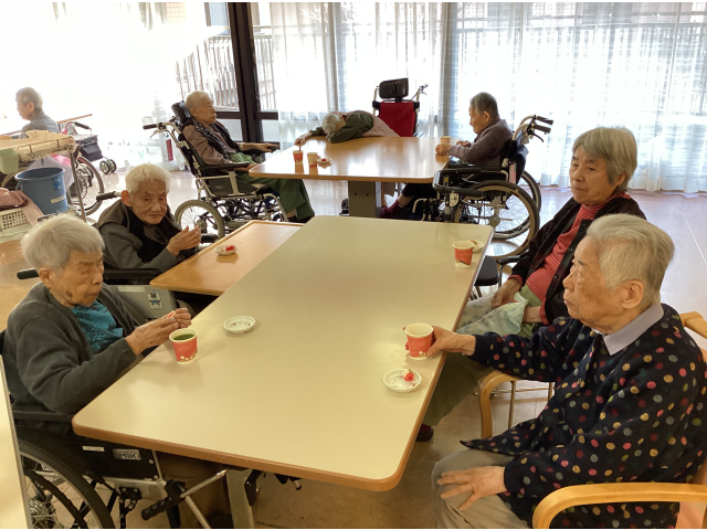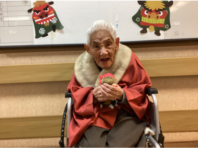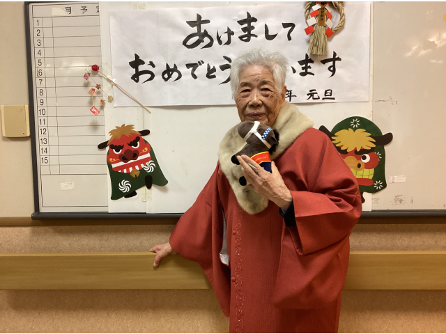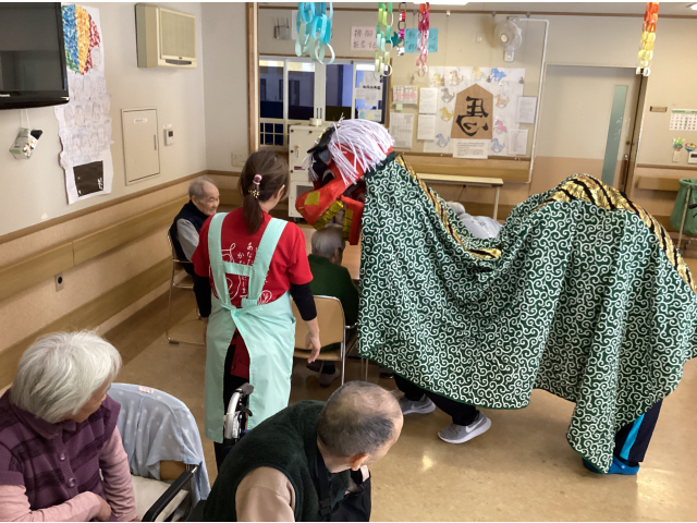 こちらは小牧苑3丁目での、新年お茶会です♪🍵グリーンティーやジュース、ねりきりを提供し、お正月気分を味わっていただきました(*^-^*)大きな獅子舞も登場し、フロアは一気に楽しい空気に包まれました♪ また3丁目ではお正月衣装を着て記念撮影を行いました。みなさんの素敵な笑顔がたくさん見られて、職員一同嬉しく思います。素敵な一年になりますように😊