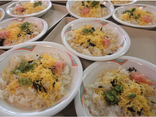 2月3日は、節分メニューです ひじきのちらし寿司、茄子の肉味噌かけ、菜の花のお浸し、いわしのつみれ汁、水ようかん 皆さん美味しそうに召し上がっていました✨