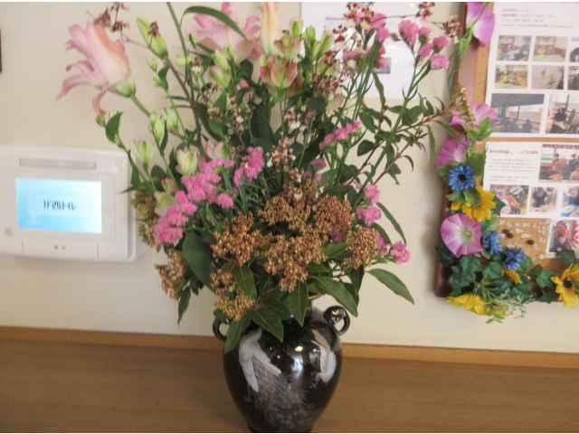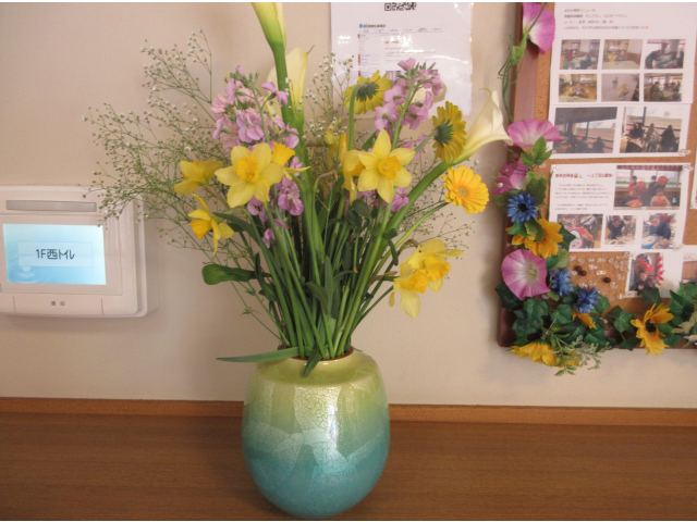 3/10(火)、今月も生け花ボランティアの皆さんに、素敵なお花を生けていただきました。とても春らしい花を活けていただきました。見に来た利用者様も「とても可愛いいね~」や「春が来てるね」など口々におっしゃられていました。