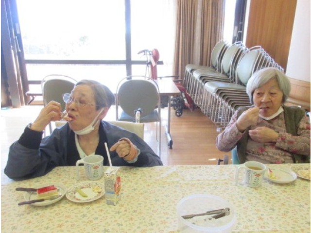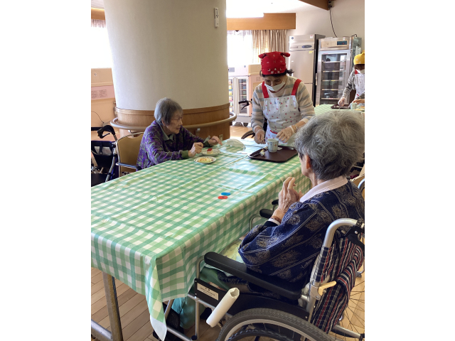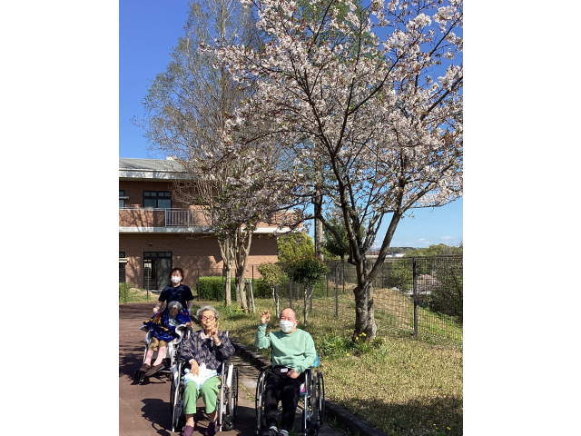 4月8日、ボランティアあかり様の協力のもと、喫茶あかりを開店しました☕ 本日のメニュー①たこ焼き ②苺のケーキ ③桜餅風デザート①コーヒー ②抹茶オレ ③カルピスからそれぞれ好きなものを選んでいただきました✨ 喫茶の後は、苑庭でお散歩🌷外の爽やかな空気に触れて皆さんとても喜ばれていました
