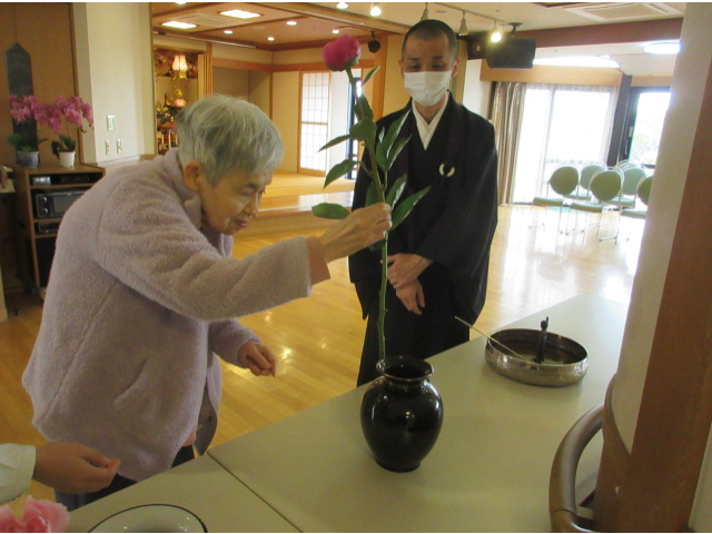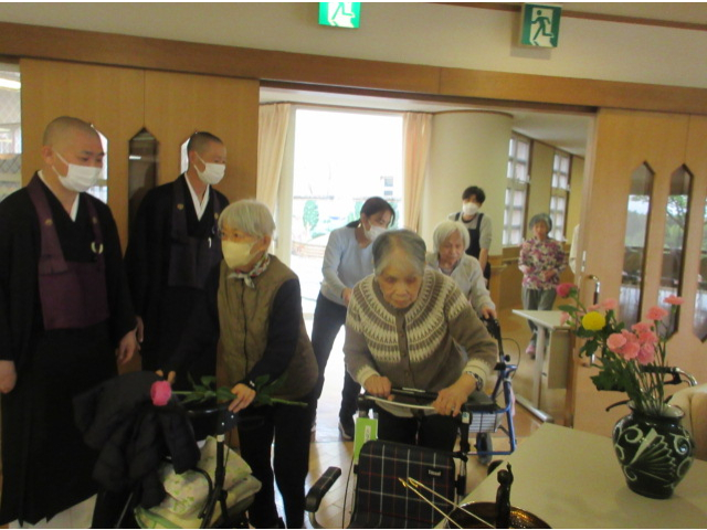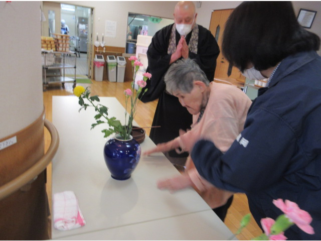 ご住職の「過去にお釈迦様に甘茶をかけてお参りをされた方もお見えでしょう。」といったお話にうなずくご利用者様も見られ、懐かしそうにお参りをされる方もお見えでした。