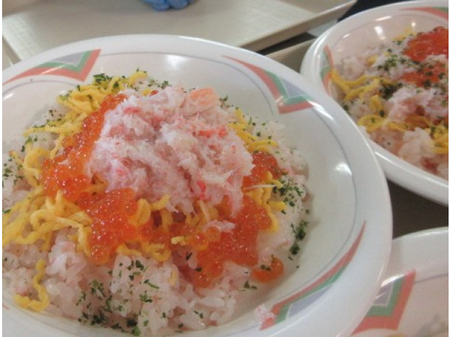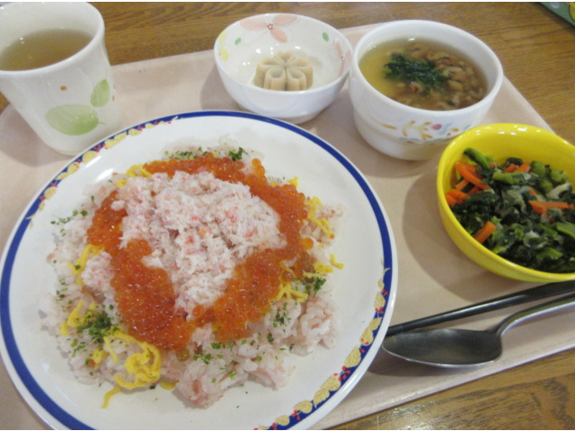 ズワイガニといくらのちらし寿司、穴子の銀あん茶碗蒸し、菜の花の甘酢生姜和え、桜のねりきり