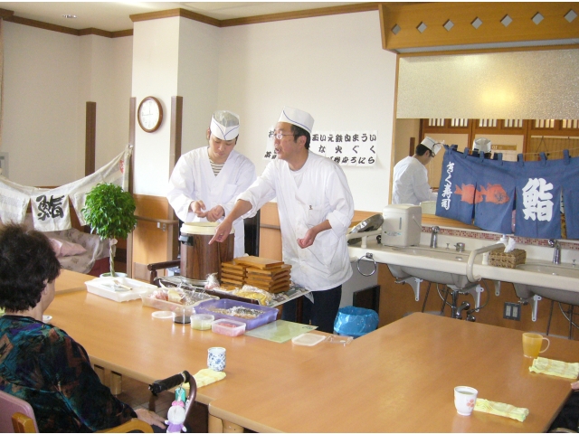 平成24年10月10日(水)、なでしこユニットで「出張!出前寿司」を行いました。寿司職人さんの威勢のいい声と北島三郎の渋い歌声をバックに、握りたてのお寿司を召し上がりました。