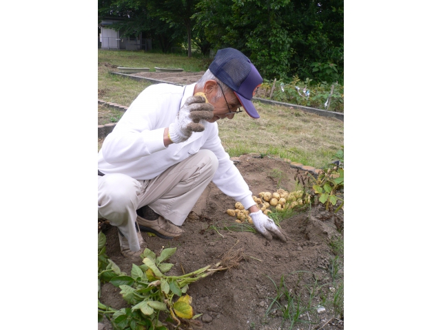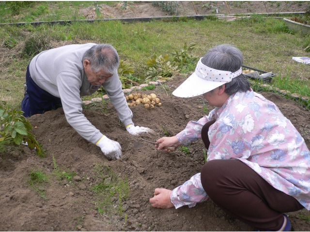2月の下旬に養護入居者様が縦2メートル×横5メートルの畑2面に植えたじゃがいもが、収穫の時期を迎えました!