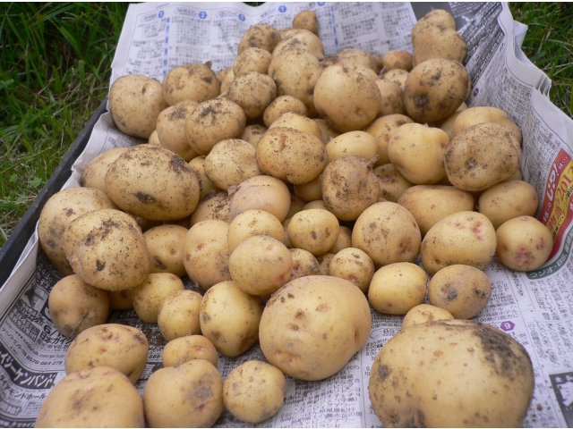 早速掘ってみると、大小さまざまな大きさや形のじゃがいも約500個掘れました!新じゃがをどのように食べるか、今から楽しみです。