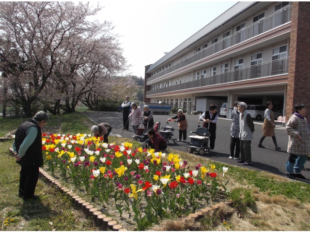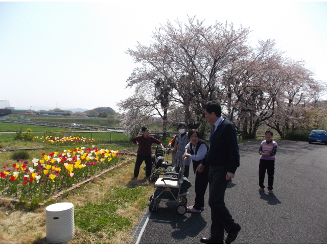 下肢筋力を鍛えるために、ラジオ体操のあとに散歩を日課に取り入れてみました。初日の今日は、天気も良く、みなさん「めざせ~養護チューリップ畑」を合言葉に色とりどりに咲いたチューリップを目指して、楽しく歩けました。少しずつ距離をのばし~、目標は、西尾苑最大の難所、駐車場のさかのぼりコースです。これからも、天気の良いときは、散歩をして、転ばない身体づくりに努めていきたいです。