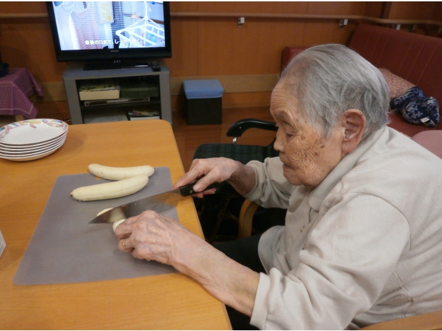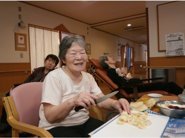 入居者様の方にも、たねを作っていただく他に、焼くことや盛り付けることなど協力していただきました。それぞれの役割をテキパキとこなし、スタッフがまごついていると声掛けなどで指導していただき、手際よくおやつが作れました。