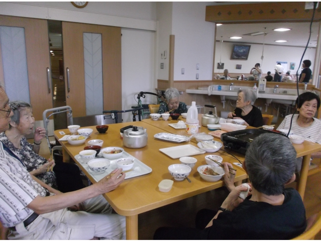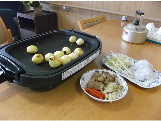 西尾苑では「焼肉の日」があります。みなさんの目の前でお肉や野菜を焼いて、出来立てを食べてもらうのです。今回は、苑内の畑で採れたじゃがいもも一緒に食べました。アツアツで柔らかいお肉や、ホクホクのじゃがいもを食べ「焼きたてはやっぱりおいしいね。」などと言いながら、みなさん楽しい「焼肉の日」を満喫していました。