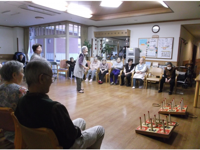 実習で来ていた学生さんと輪投げゲームをして「輪を投げるのは難しいね」と言いながら一生懸命投げる入居者さん、「もっと遠くから投げられるよ」と部屋の角から輪を投げ、ゲームに挑まれる入居者さんと思い思いに参加されていました。