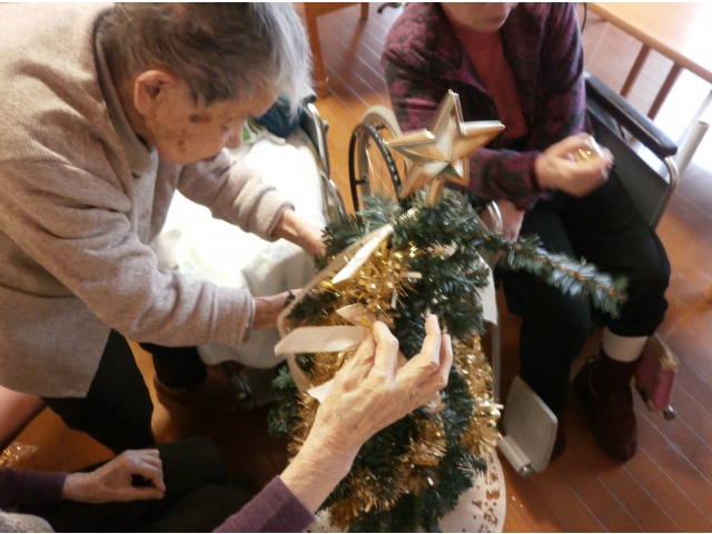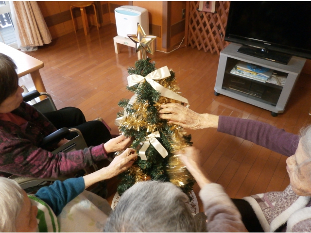 12月に入り、雨が降るたびに段々と寒くなってまいりました。少しでも季節感を感じてもらおうと思い。皆さんと一緒にクリスマスツリーの飾りつけを行いました。ツリーを見て皆様それぞれ何かを連想するようで、中には「もうすぐ紅白だね」「クリスマスは大人がお金を使う日だで、大人がクルシミマス」「ジングルベルの歌知ってるよ」などとおっしゃられていました。