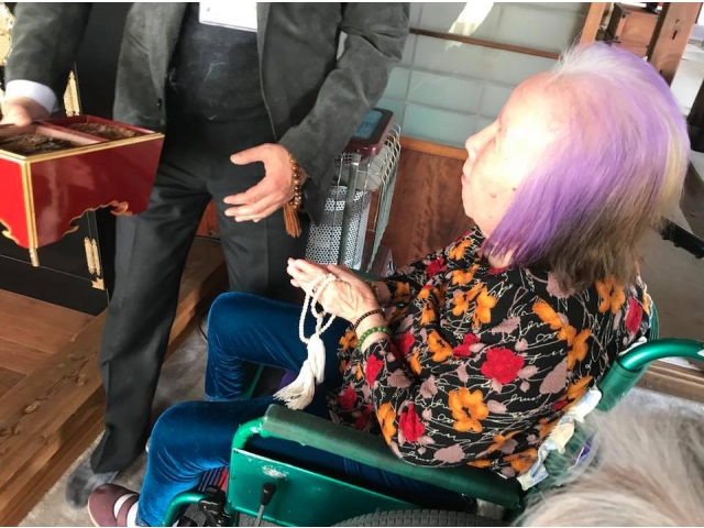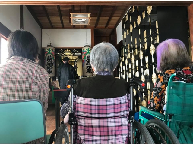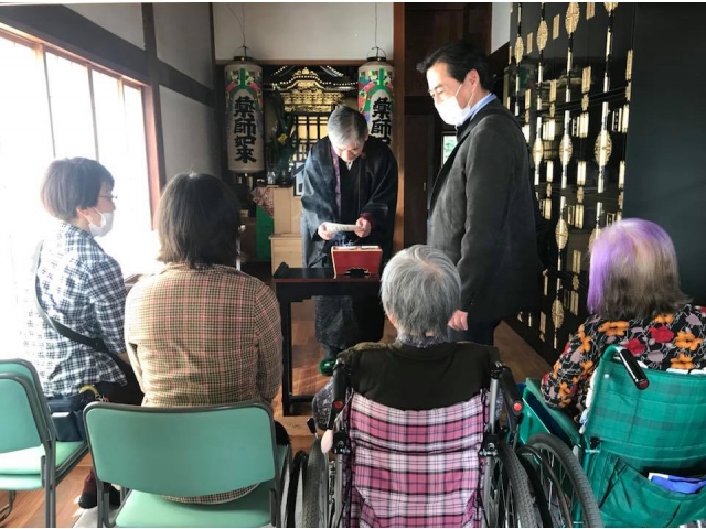 今日は、ユニットで写経に取り組んでいる方々と西尾市ある宿縁寺さんへお邪魔しました。住職さんがとても親切な方で、本堂まで車椅子を上げさせていただきました。