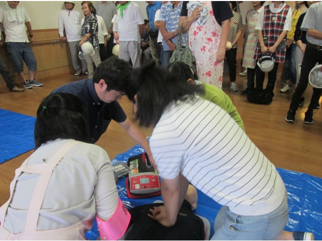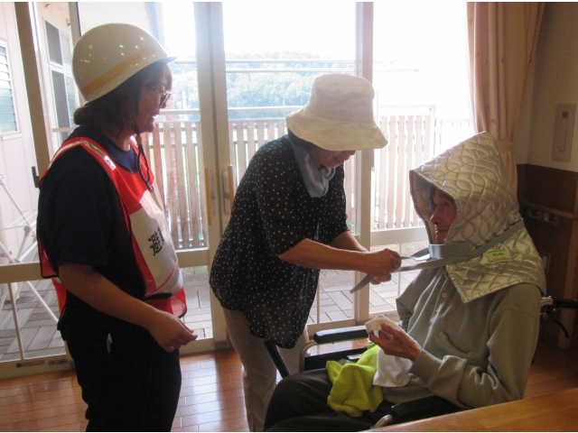 - 町民の方にも防災ずきんを装着したり手伝っていただきました。