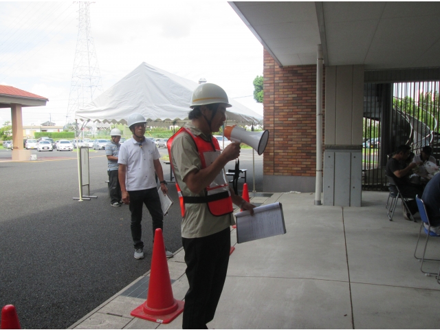 地域の防災無線放送を使って地域の皆さんに応援要請を流し、西尾苑にご参集していただきました。苑長からの挨拶。次長からは今回の避難訓練の概要が説明されました。今回は西尾苑で火災が発生した際に避難が困難な方々のお手伝いを八ツ面町の方々にご協力いただくという想定です。
