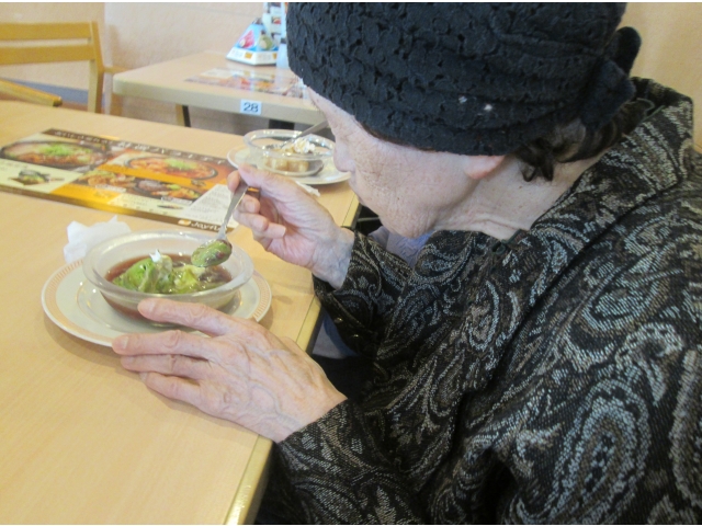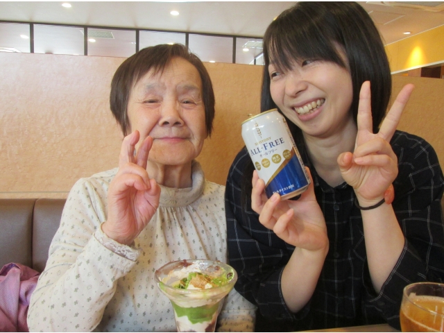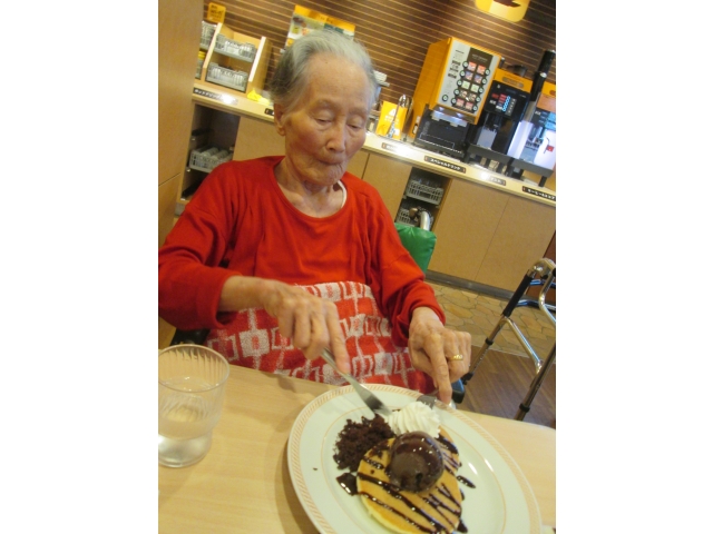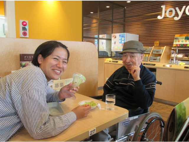 9、10月の外出活動は西尾苑から車で1分のところにあるファミリーレストラン「ジョイフル」です。今回の希望者は45名、11グループに分かれてティータイムを楽しみました。