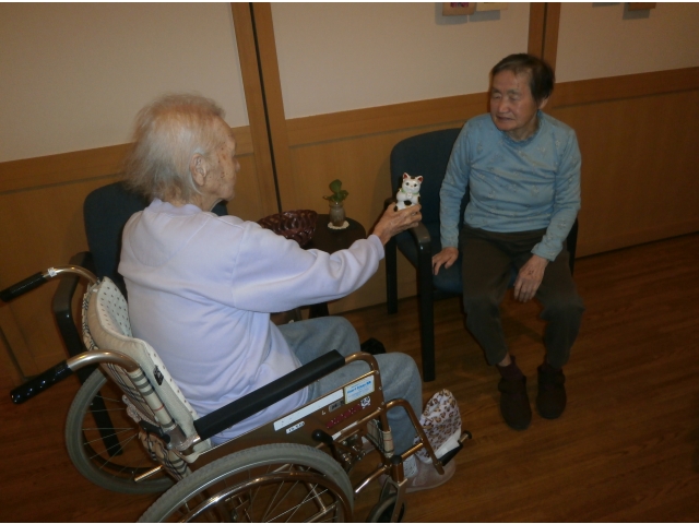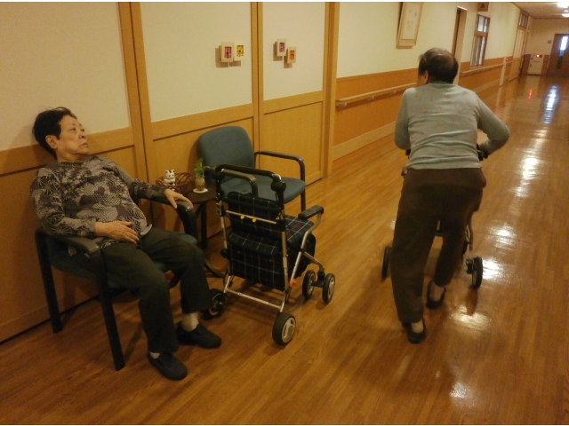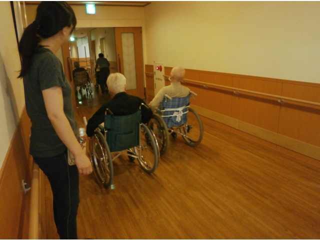職員が声をかけたり、入居者様同士が声をかけ合ったりし車椅子を自ら操り