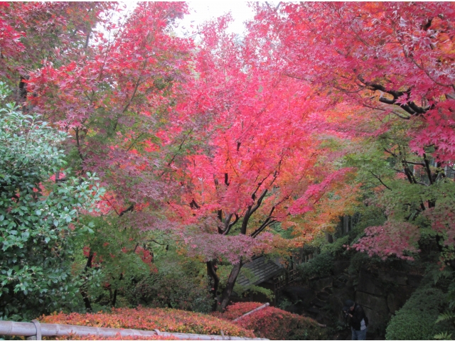 見事な日本庭園には季節折々の植物が植えられており、今の季節は赤く染まった葉が光を通してとても美しく見えます。お庭の中央にある詩仙閣から眺める景色は四方八方どこを見ても絵になるので、花嫁さんが前撮り写真を撮りにきているところに何度か遭遇しました。