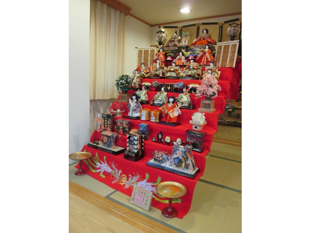 西尾苑の1階、談話スペースには大きな大きなひな飾りがあります。高さは2メートル近くもあり、間近で見るとその絢爛豪華が際立ちます。このひな人形は昨年、地域の方からのご寄付でいただきました。