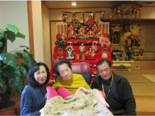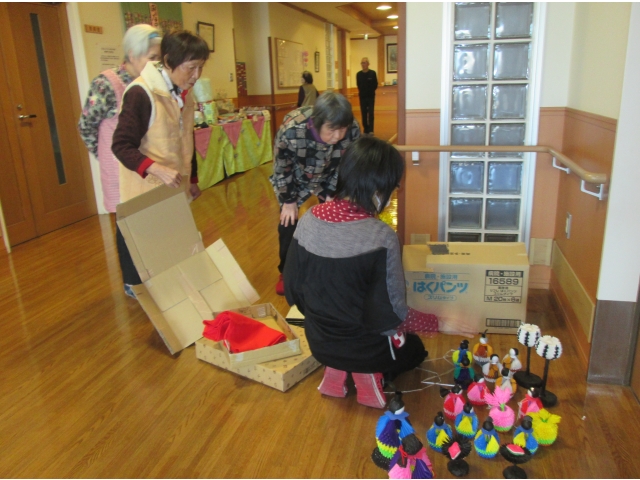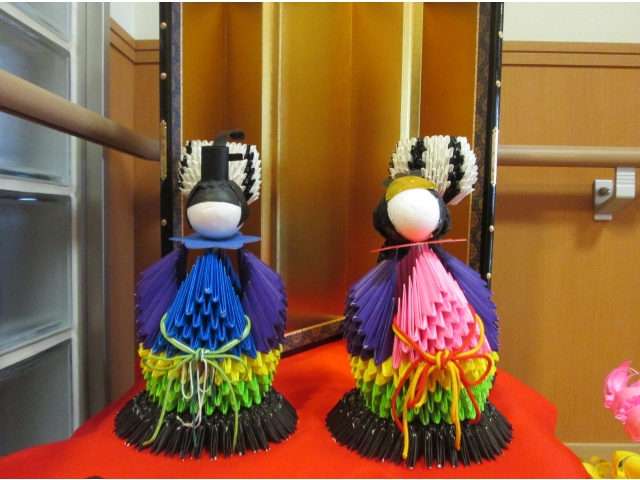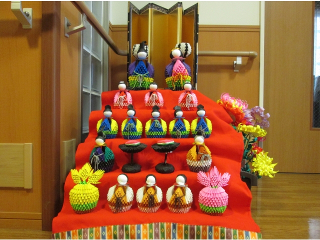 もう一つ、正面玄関入ってすぐかわいいひな人形があります。養護老人ホームの入所者様の手作りのひな人形です。折り紙を一つ一つ丁寧に折り重ねたものです。