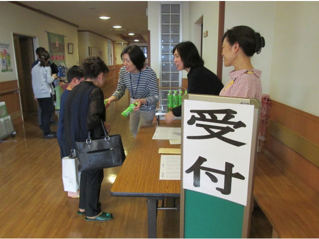 介護主任が玄関で受付、今年も1階養護老人ホーム食堂で開催しました。