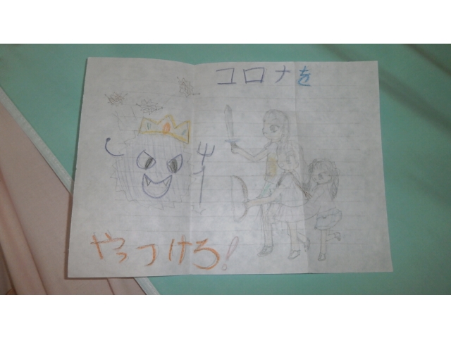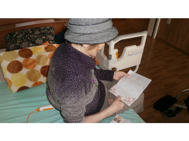 声を掛けると、笑顔で「ごめんね。遅くまで起きていて。手紙を読んでいたの」と。娘さんからの手紙でした。ひ孫さんたちが描いたかわいらしい絵も入っていました。感染症対策のために面会ができず会えないので、手紙が届いたようです。