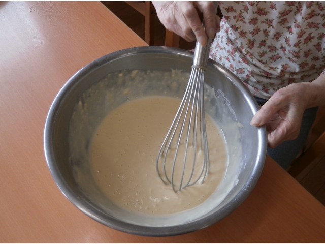 一生懸命、入居者様が生地を混ぜていますが、皆さんは何を作っていると思いますか?