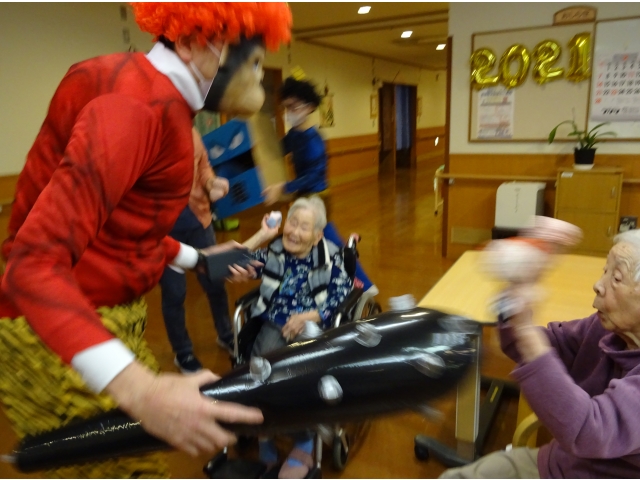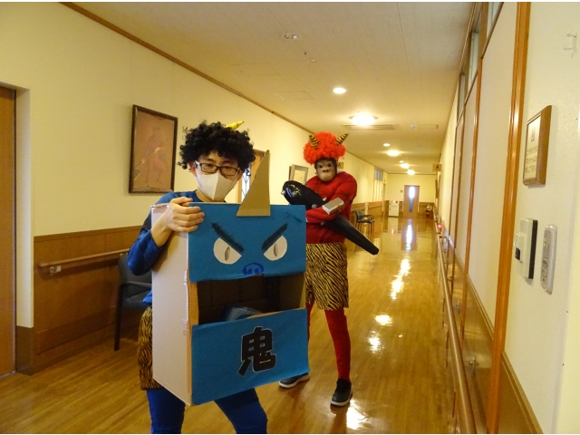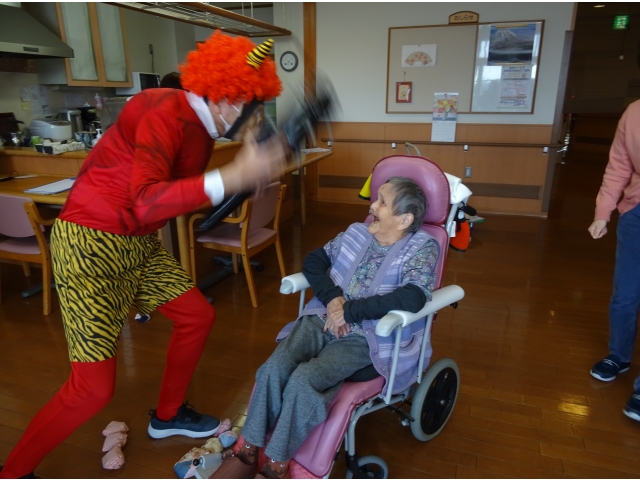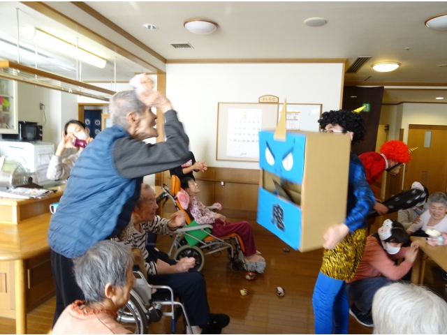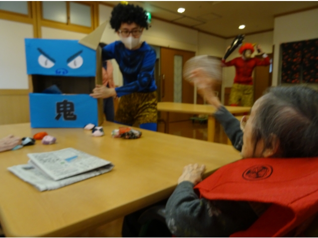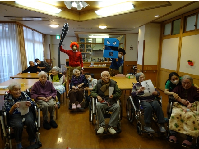 鬼の登場に最初はビックリするご入居者様ばかりですが、周りの職員の声に合わせて懸命にお手玉を鬼に投げていました。鬼退治の後は記念撮影を行い、清々しい気持ちのまま1日を過ごすことが出来ました。