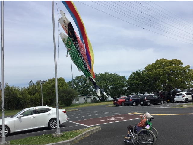 日中は暖かさを超え暑さを感じるほどの気候ですが、ご入居者様が散歩や職員のお手伝いのために、駐車場内を歩いている姿をよく見かけます。元気な鯉のぼりの姿を見て、パワーを感じてもらえると大変嬉しく思います。