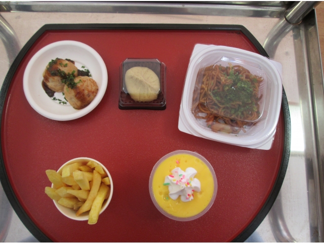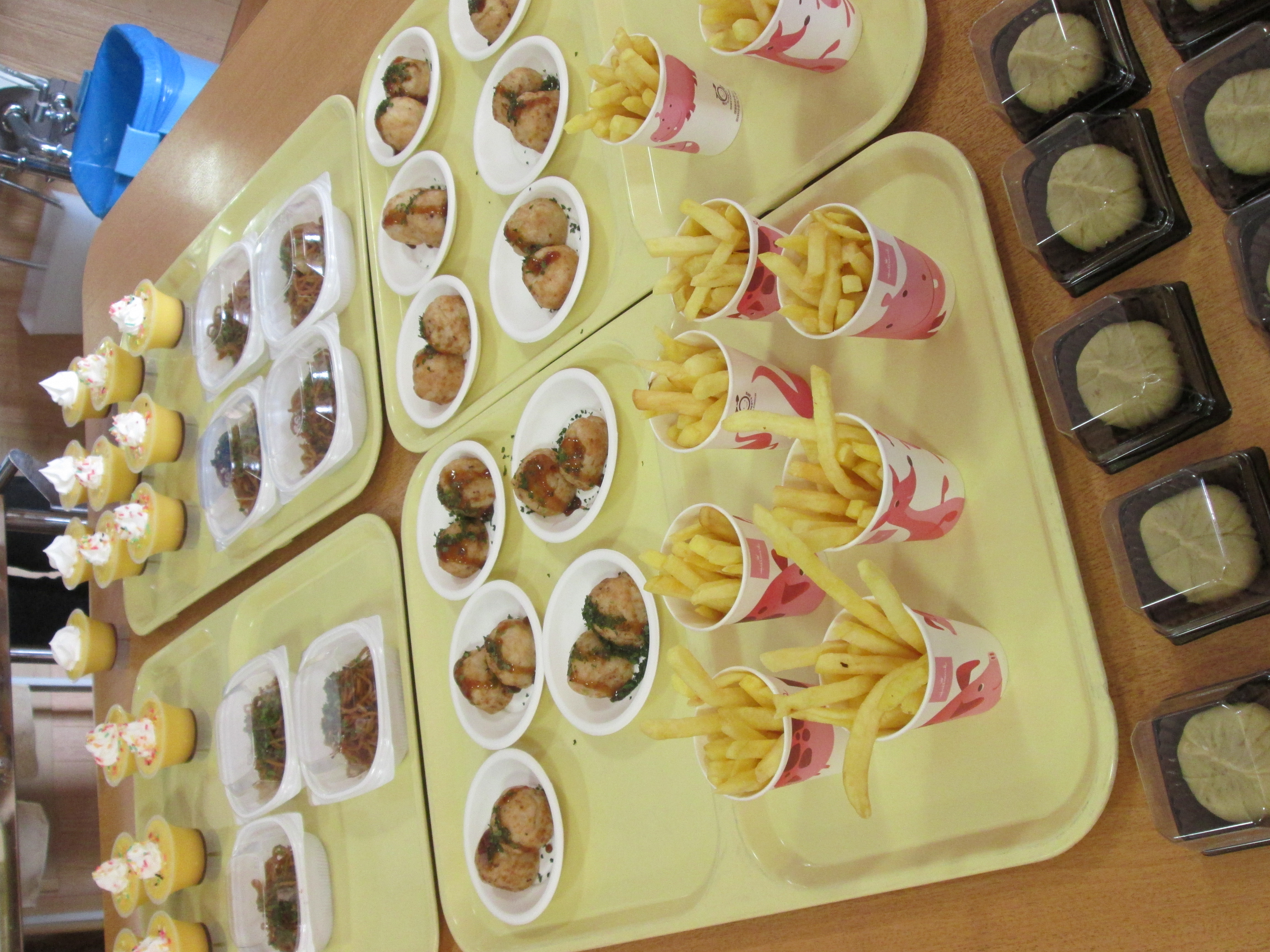 「たこやき」「やきそば」「フライドポテト」「かぼちゃプリン」「くりきんとん」とお祭り定番のものから、秋を感じるものまでを用意し、バイキング形式での喫茶です。さらに祭りの雰囲気を味わって頂くために、職員一同はっぴを着用したり、「東京音頭」「お祭りマンボ」と言った音楽を流したり、紅白幕やちょうちんの飾り付けをしたりと様々な工夫を凝らして行いました。