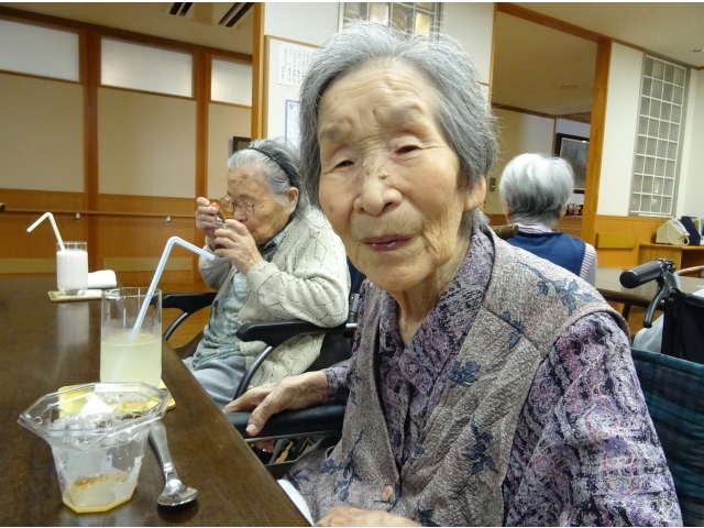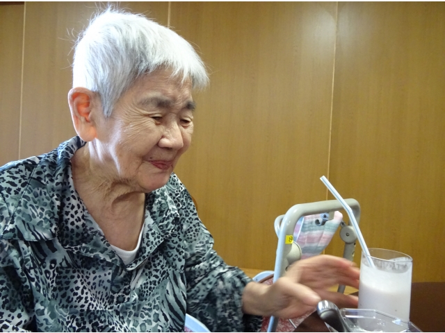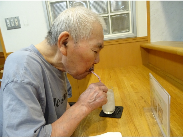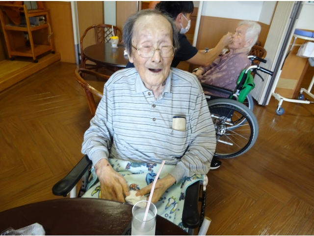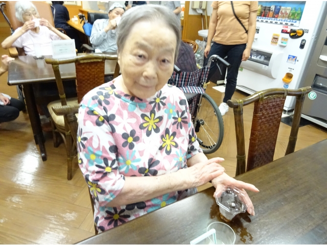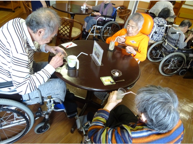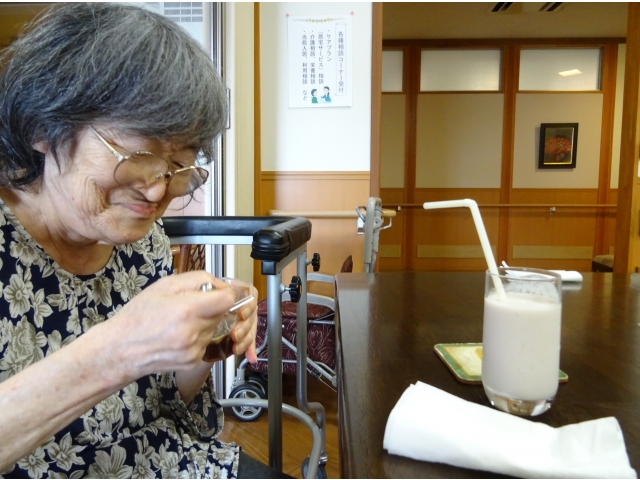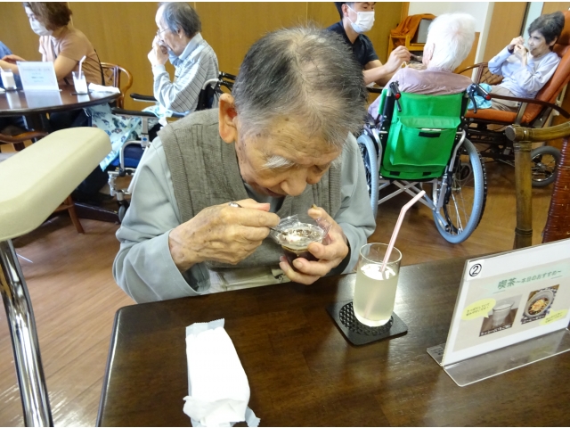 実習生さんが考えてくれたおすすめメニュー“ラッシー🥛✖コーヒーゼリー☕”。 別日の別ユニットの方たちにも提供しました。 おすすめメニューをお伝えすると「ラッシー❓なんだい、そりゃ❓」「ラッシー❓わからんなぁ❓」と前回の方たちと同じ反応をされる利用者様たち☺。それでも写真や説明を聞いて、たくさんの方が注文をしてくださいました☺。 チーム喫茶