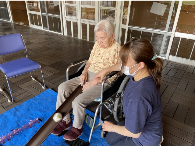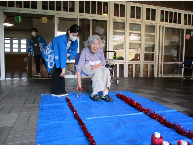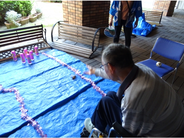 投げることが難しい方はスロープを使って職員と一緒に投げました。