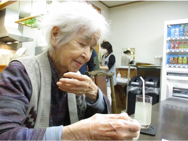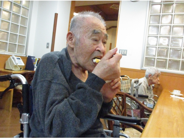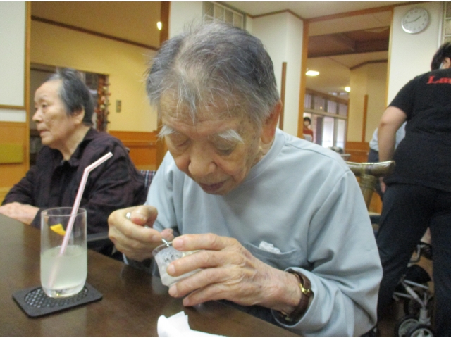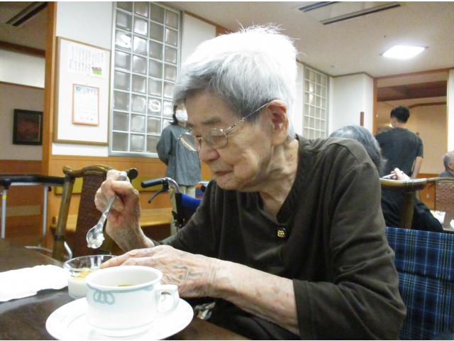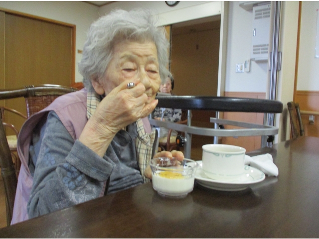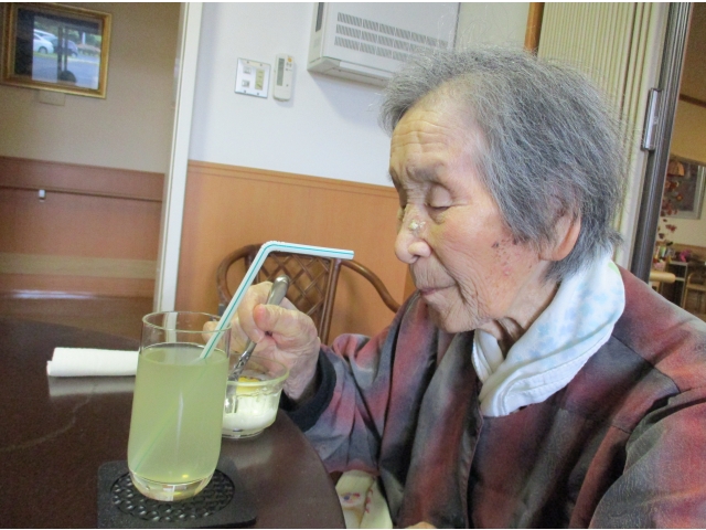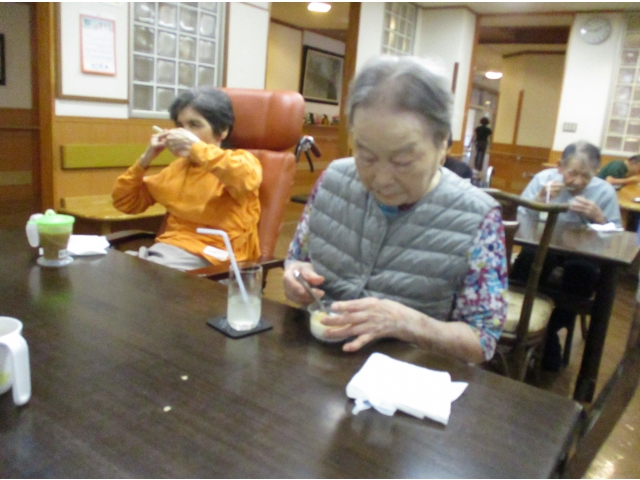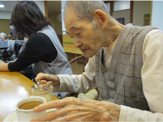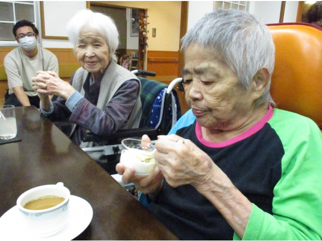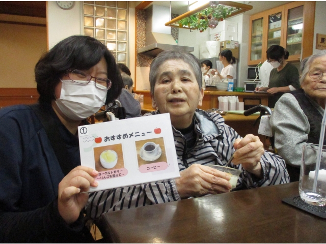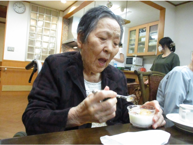 利用者さんの元へ運ばれたヨーグルトゼリー<リンゴ🍎のコンポートを添えて>は、「おいしいねぇ☺」と、お口の中へするすると消えていきました。