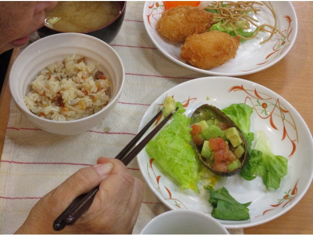- 本日のお献立 「チャーハン・スープ・かに爪フライ・アボカドサラダ」
