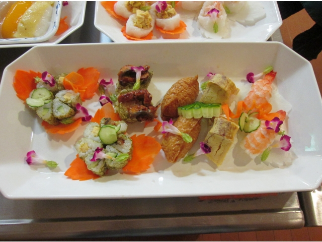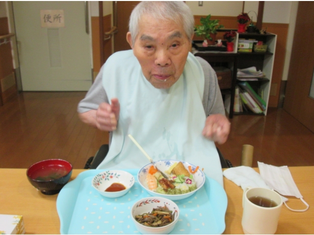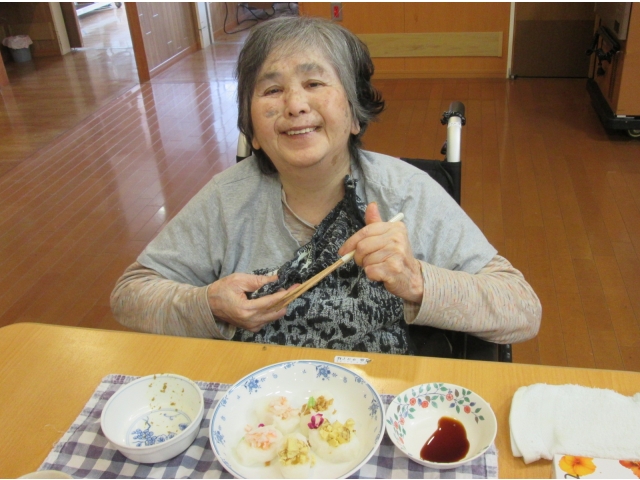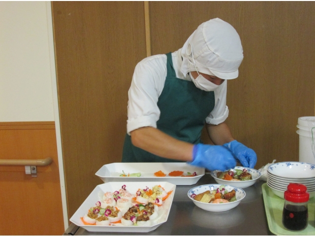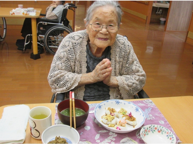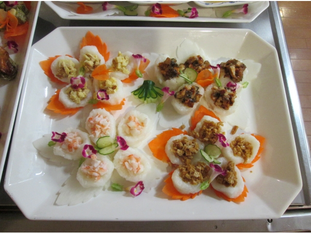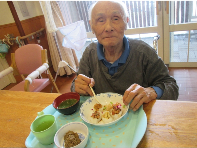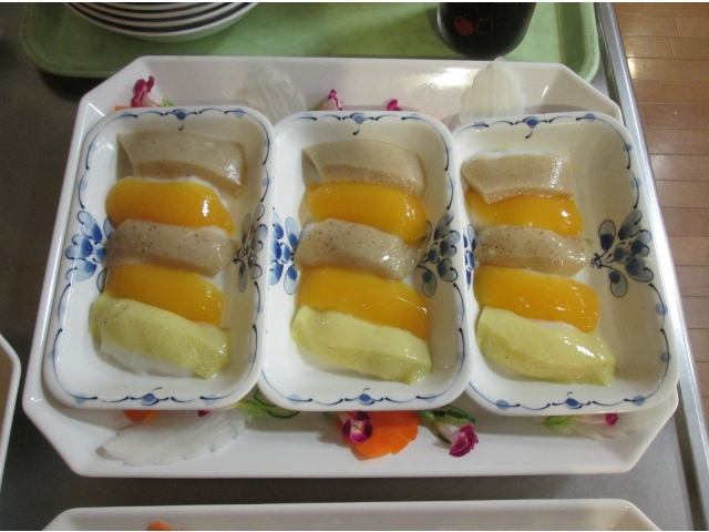 飾り切りされた野菜をみつけて「豪華だねぇ」「きれいだねぇ」と感心しきりの入居者様。お寿司🍣のお味はもちろん、見た目も素敵なランチでした。