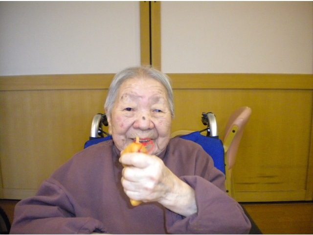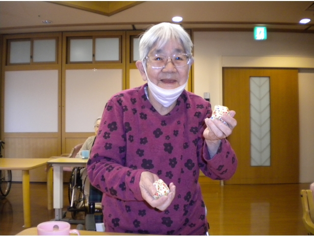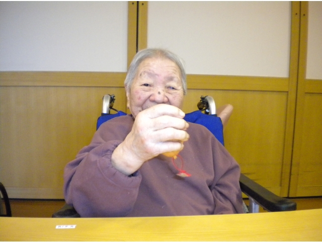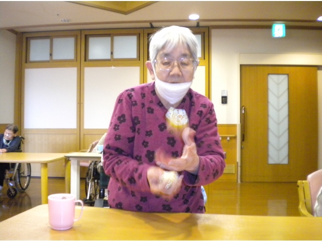 ご家族が持参された軟らかい器具(クロワッサン🥐の形をしてます!?)を使い手で握る力が衰えない様リハビリ中です。ストレス解消にも良いそうです😊。 みなさん健康に気を付けていつまでも元気でお過ごしください✨。