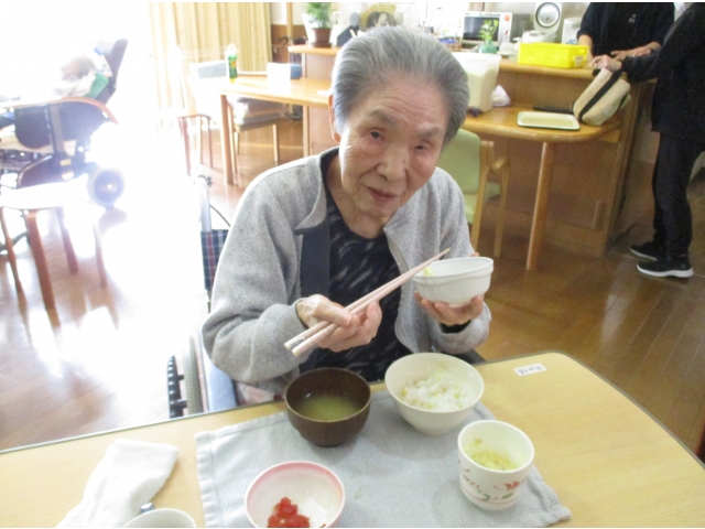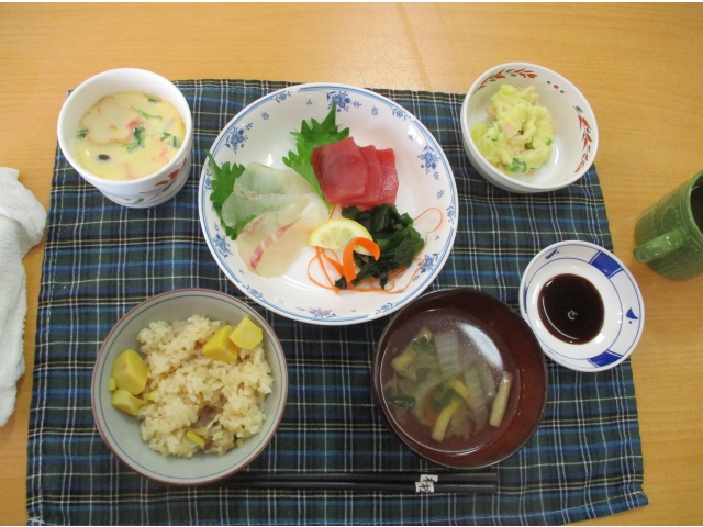 食事形態がまちまちな入居者様全員がおいしく楽しく食べられる料理ということで、ユニットスタッフが「栗ご飯・刺身・茶碗蒸し」のオーダーをしていました。