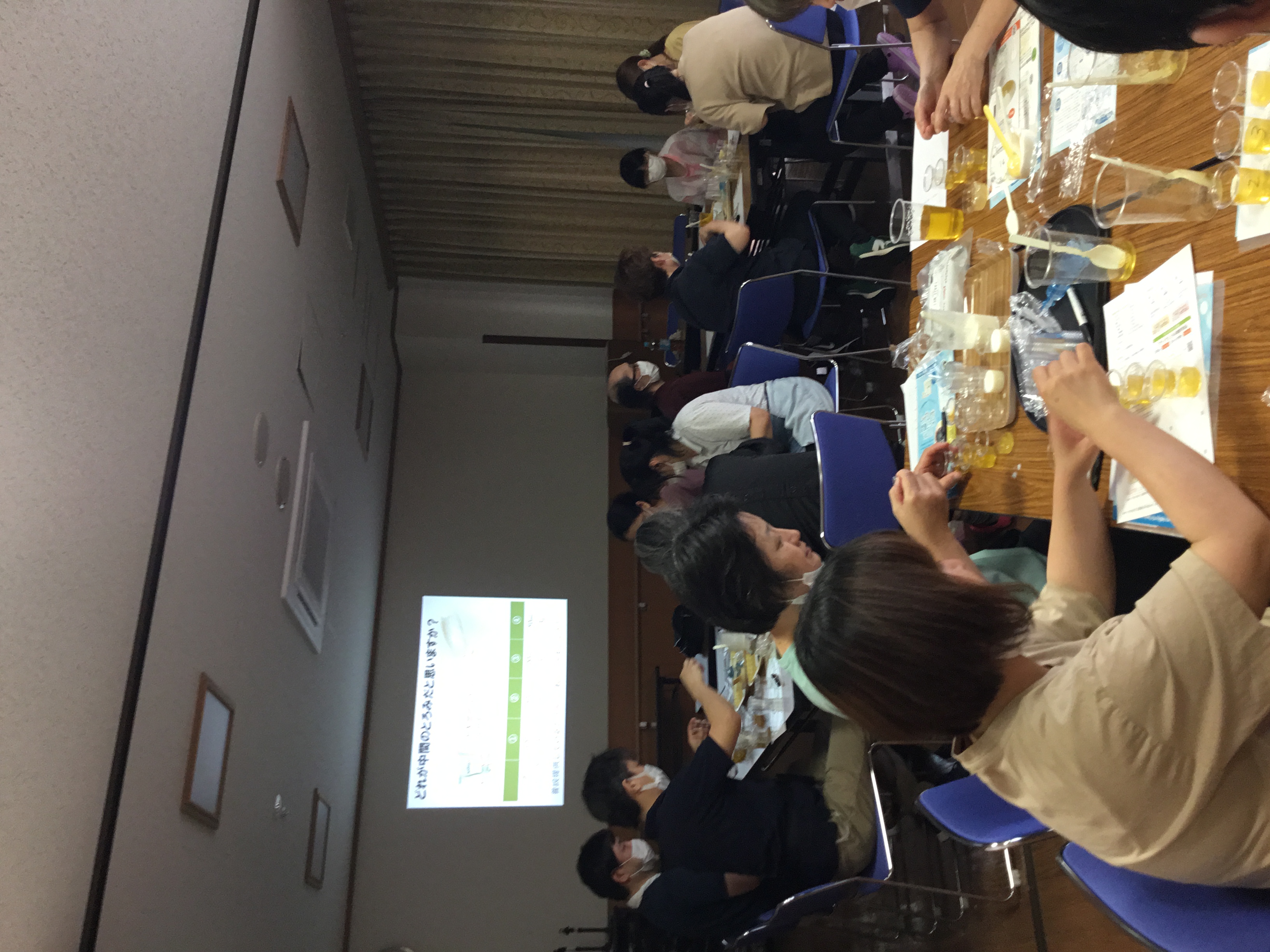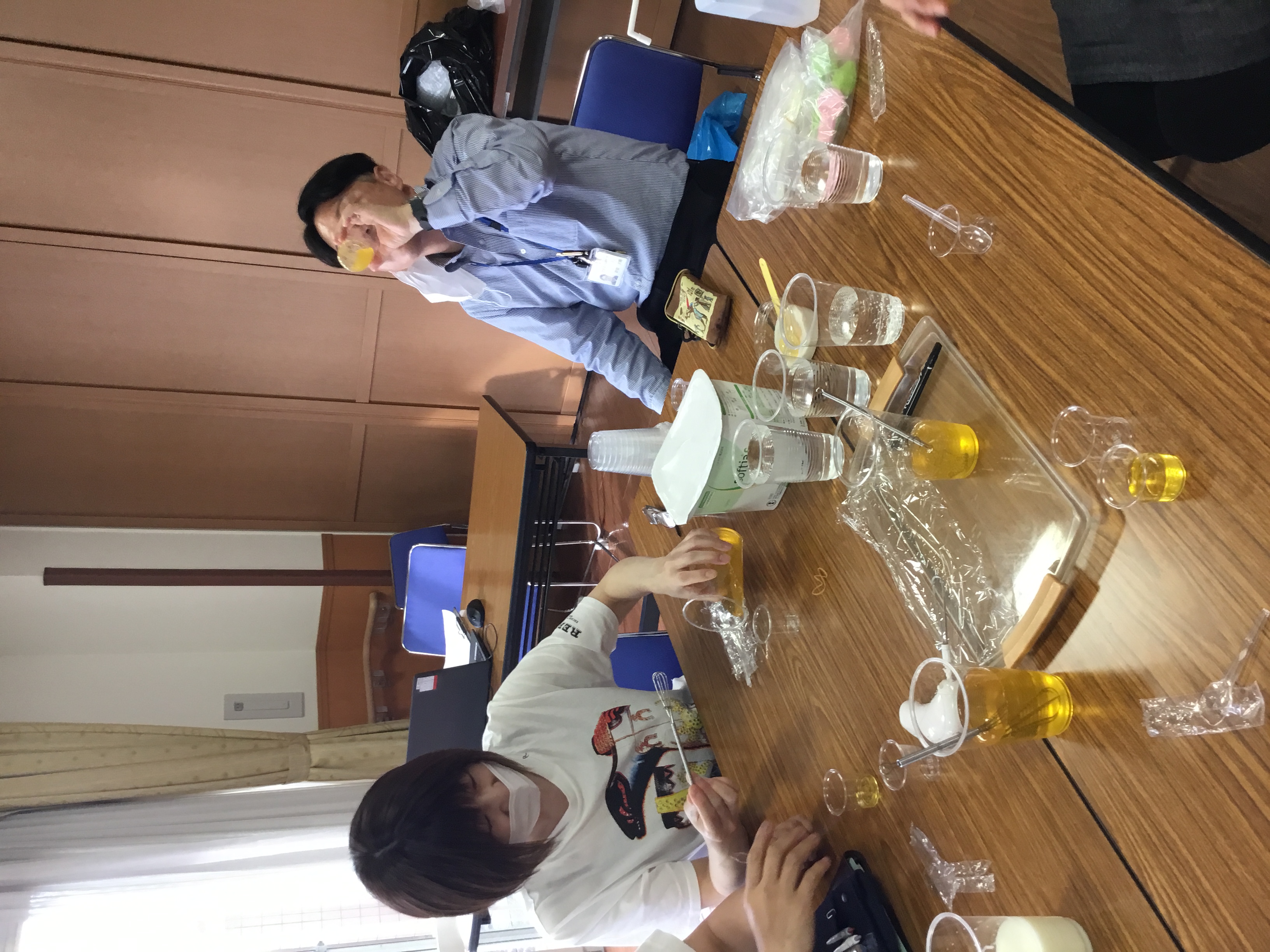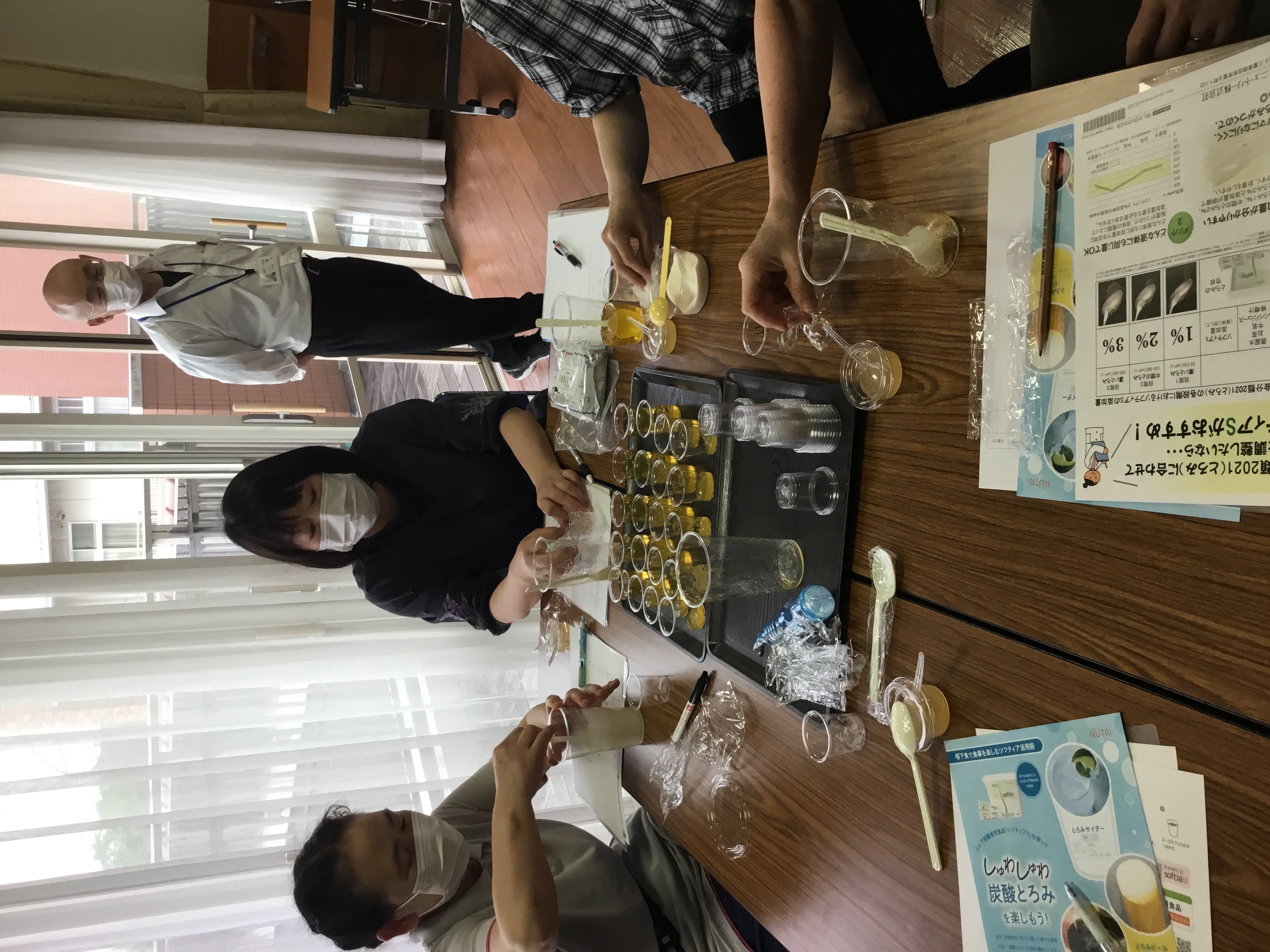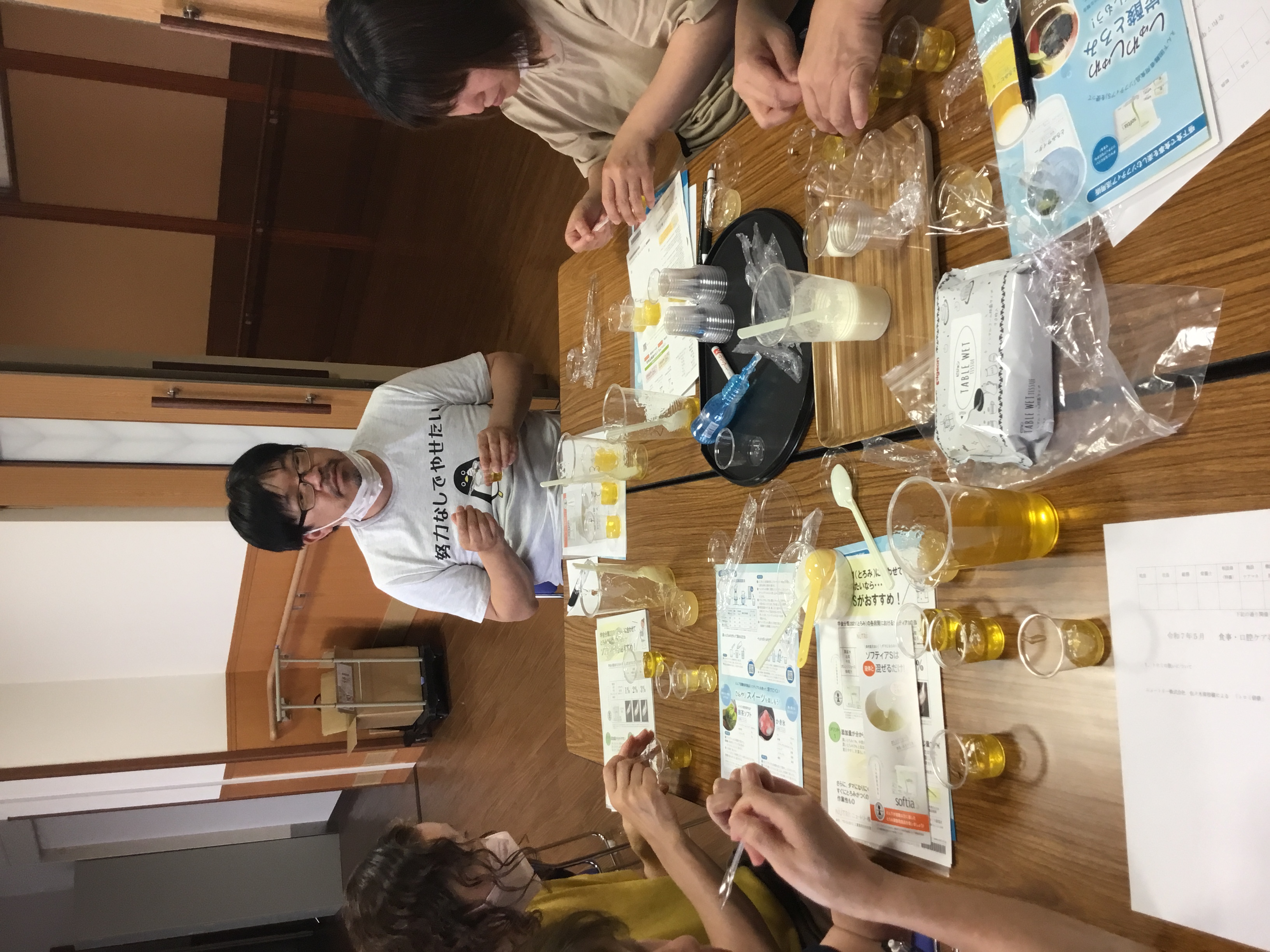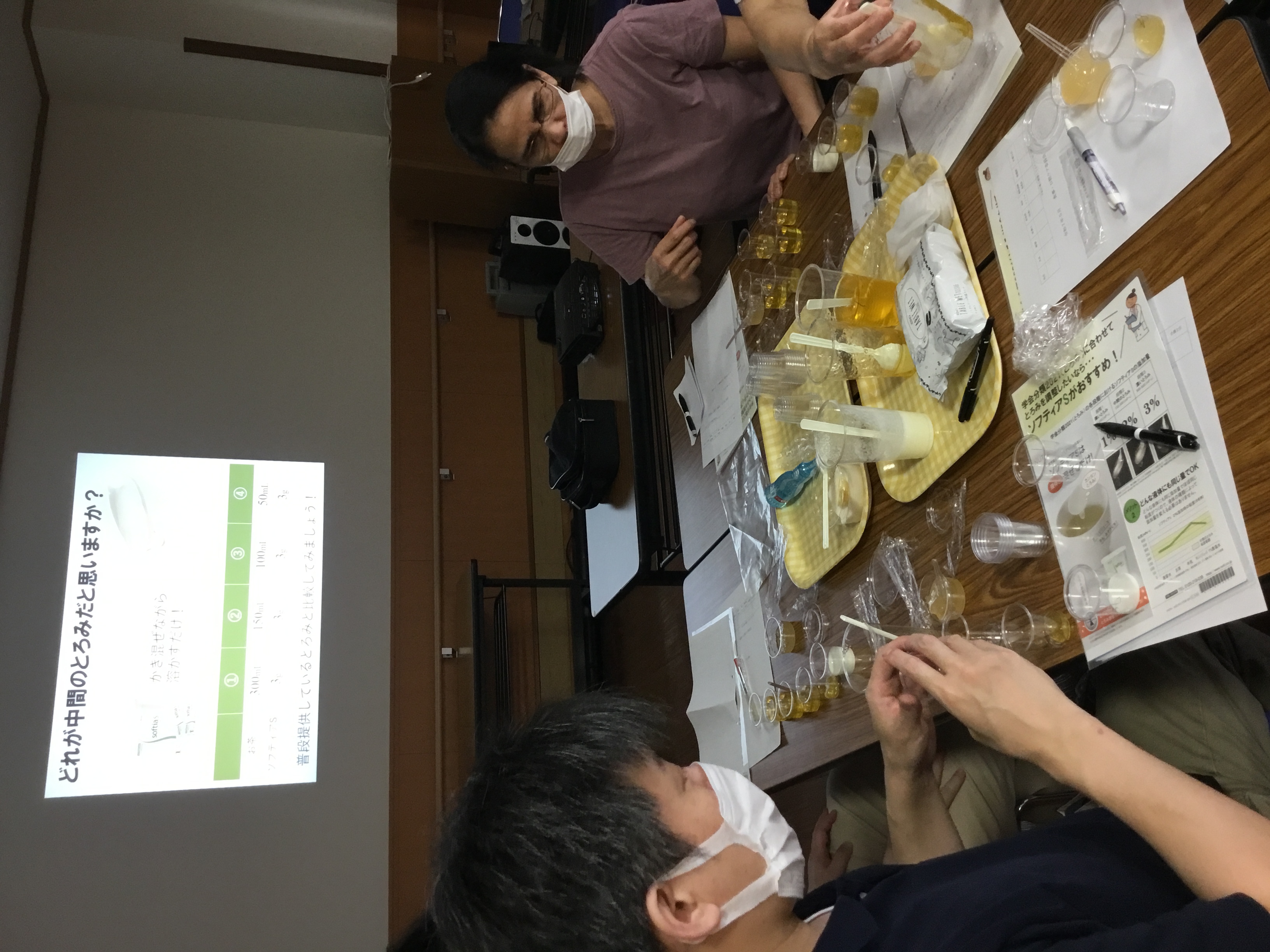 とろみはつけすぎると、口の中にへばりついて、逆に飲み込みづらくなってしまうことや、ゼリーなどの固形の物のスライスの方法など、職員自身が身をもって体験をさせていただきました。