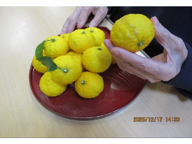 早いものでもう12月。苑内で採れた柚子を見て「立派だねー」「匂いがいいね」「季節物だね」などと喜ばれ、冬至の柚子湯を楽しみにされている方もいました。 まだまだ寒い日は続きますが、、、来年もみなさんがお変わりなく過ごせたらいいなと思っています。
