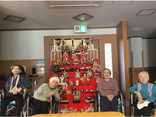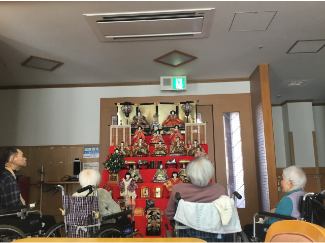 春めいてきたので外に散歩に行こうと思いましたが、強い風が吹いており、寒波だったので苑の中を散歩しました。ひな祭りは終わりましたが、まだ立派なひな人形が飾ってあったので皆さんで記念撮影をしました📸