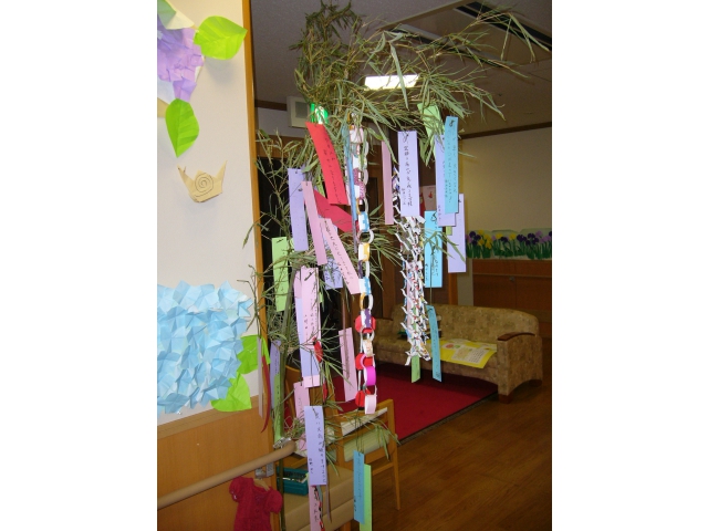 梅雨でジメジメしたこの季節。それを吹き飛ばすかのような鮮やかな色紙で作ったアジサイの壁紙。その横には、ご利用者様の願いを込めた短冊が付いた七夕かざりがあり、季節感満載の西尾苑のデイサービスとなっております。