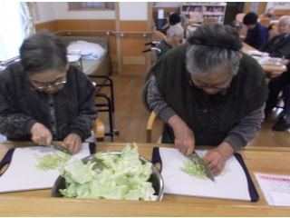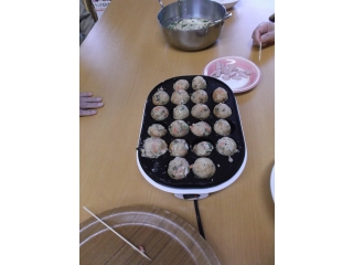 ある日の利用者さんの何気ないその一言で今月の手作りおやつウィークはたこ焼きに決まりました。以前はお台所を切り盛りしてきた利用者さんも今となっては包丁を握る機会もなくなってしまったと話すかたも多いのですが、キャベツをリズムよく刻む姿はとても生き生きとされていました。できたてアツアツのたこ焼きを頬張り「初めて食べた!」「うまかった~」とうれしい声が聞こえてきました。