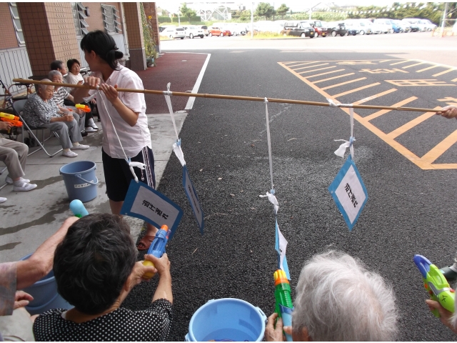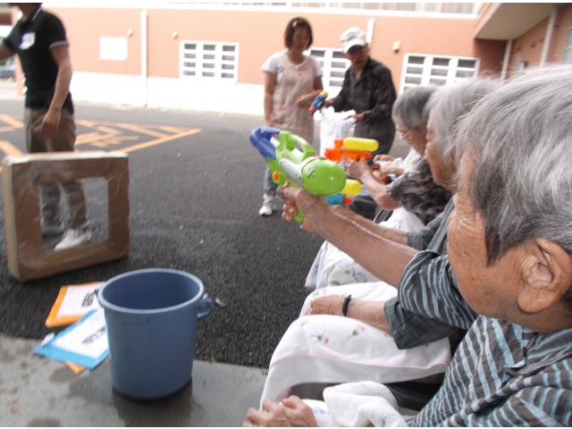 そこで、少しでも涼をとってもらおうと水鉄砲ウィークと銘打って中庭で思う存分、水遊びをしました。