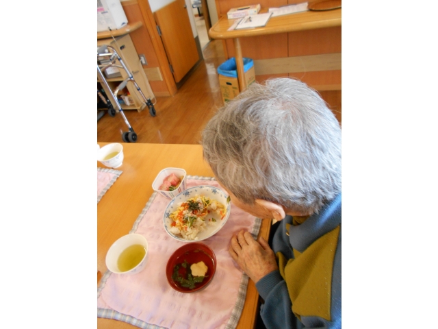 お昼ご飯はひなまつりといえばちらしずし。彩もきれいに厨房さんが作ってくださいました。