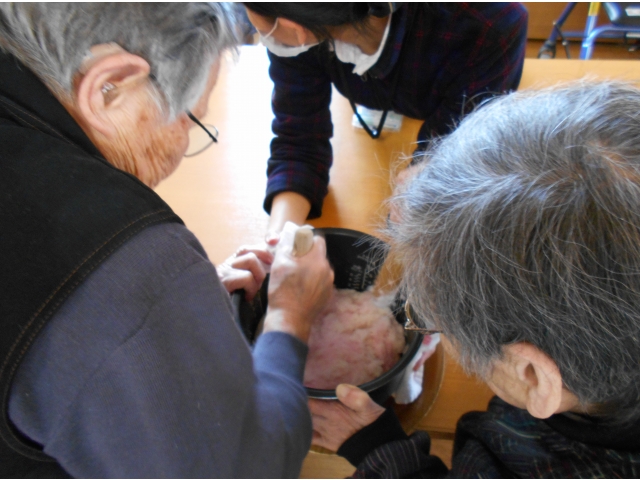 おやつは炊飯器で炊いたもち米を炊飯器ごとペッタン、ペッタン