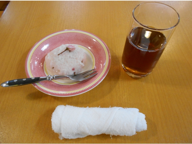 八ツ面山(西尾苑の目の前にある山)に咲いた桜の花々みたいな桜餅ができました。